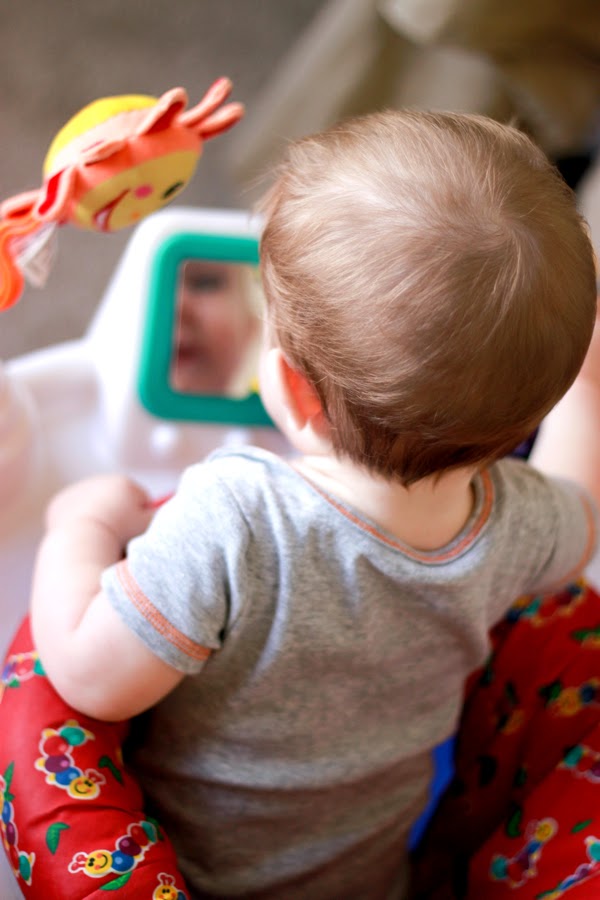Dunken's favorite toy is his saucer. The saucer was given to use by some friends in our neighborhood and I'm so glad they did. He loves it! It's really like 10 toys in one so it's no surprise he likes it so much. Most of the time when he plays in it he just chews on everything, but every so often he spends his time looking in the mirror. He leans in really close and smiles and squeals at himself.
